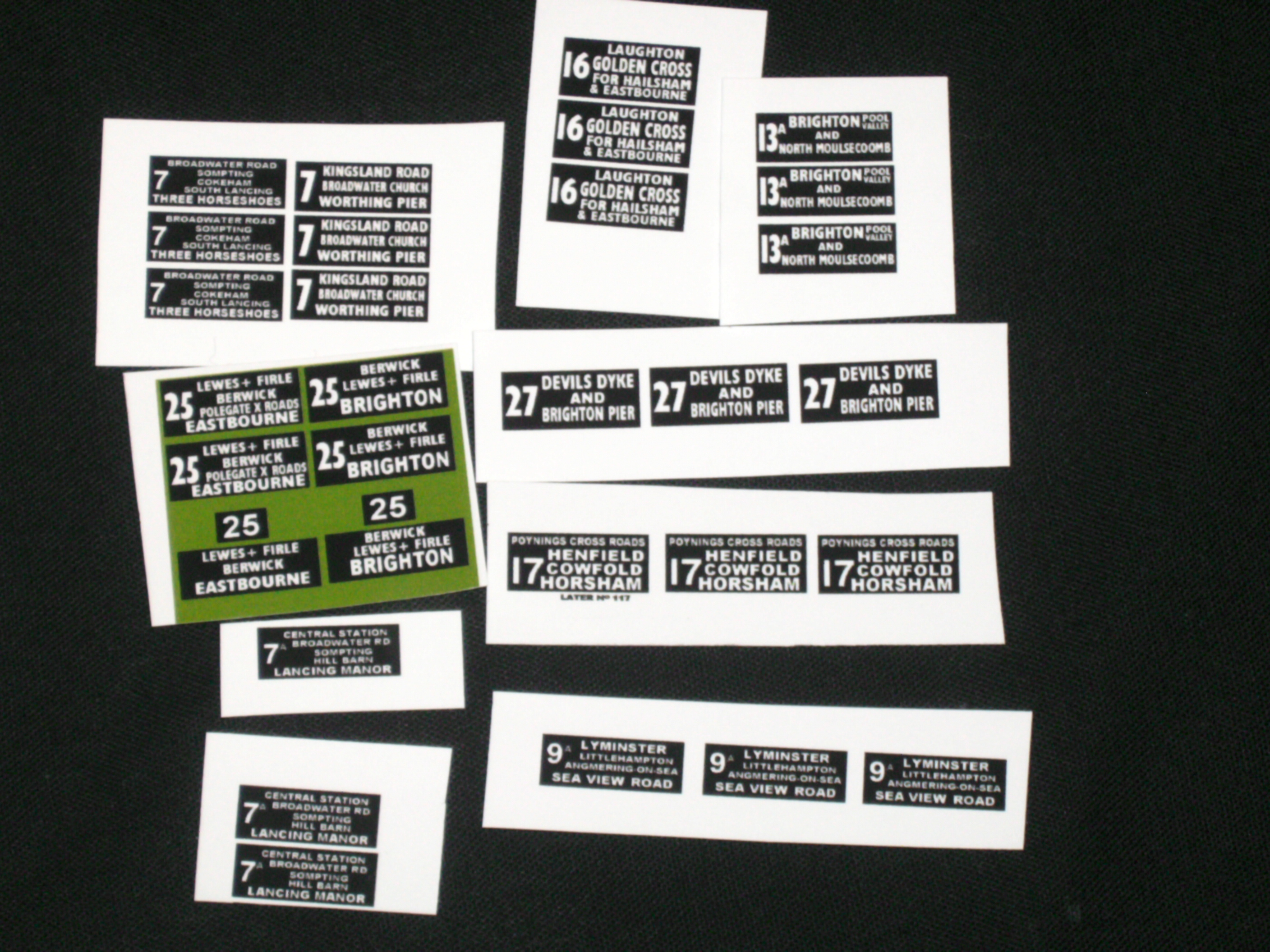 Set 2 Southdown Self Adhesive Model Bus Routes7, 7A, 9A, 13A, 16, 17, 25, 27 1/76th/00 Scale With self adhesive routes there is no need to remove the original routes, no messing with water, just cut to size, peel the back then stick to the bus.